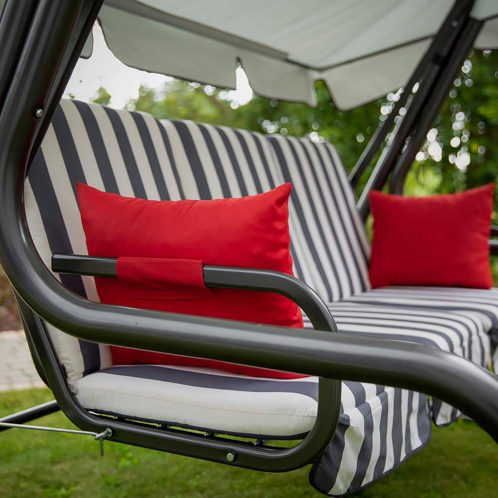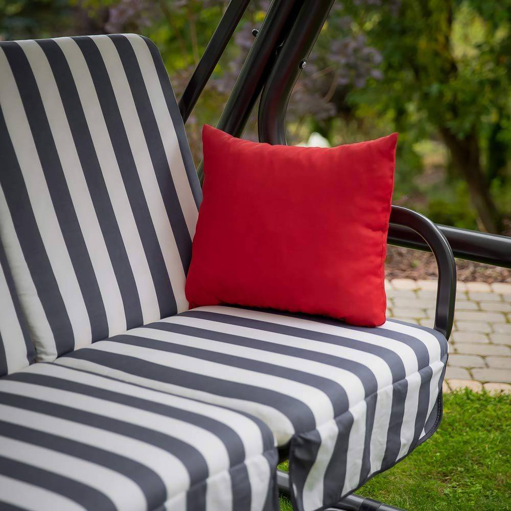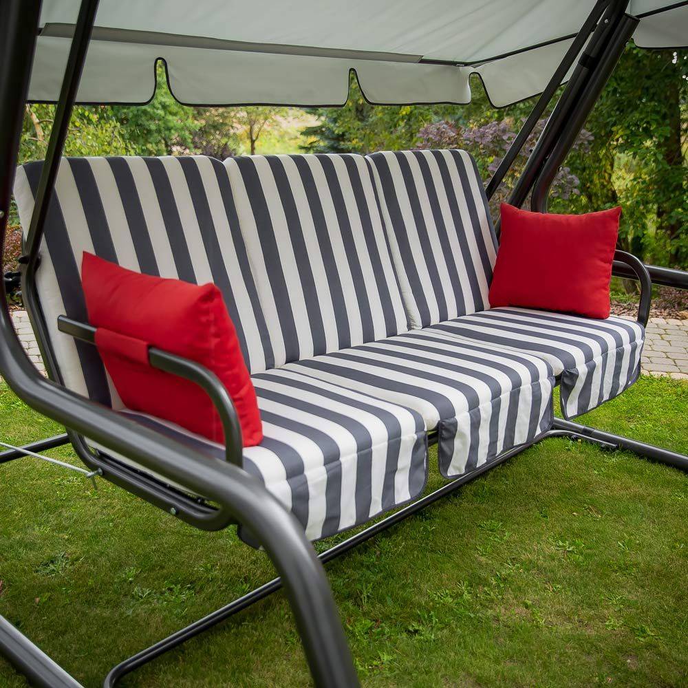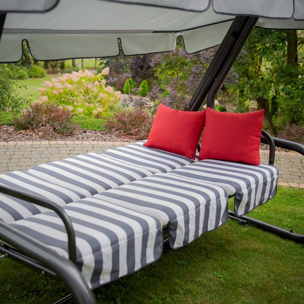 Dynor till hammock har utformats med fokus på komfort och hållbar användning. Fyllning av polyuretanskum, omsluten av fiberduk, ger en optimal balans mellan mjukhet och stabilt stöd. Det behagliga tyget passar för daglig användning och är samtidigt lätt att sköta. Praktiska knytband gör det möjligt att snabbt och stabilt fästa dynorna på hammockens konstruktion, vilket förhindrar att de glider. Den dekorativa volangen framhäver produktens genomarbetade utseende. Setet kompletteras med armstöd med bekväm fyllning och kardborrefäste, vilket ökar komforten vid användning.